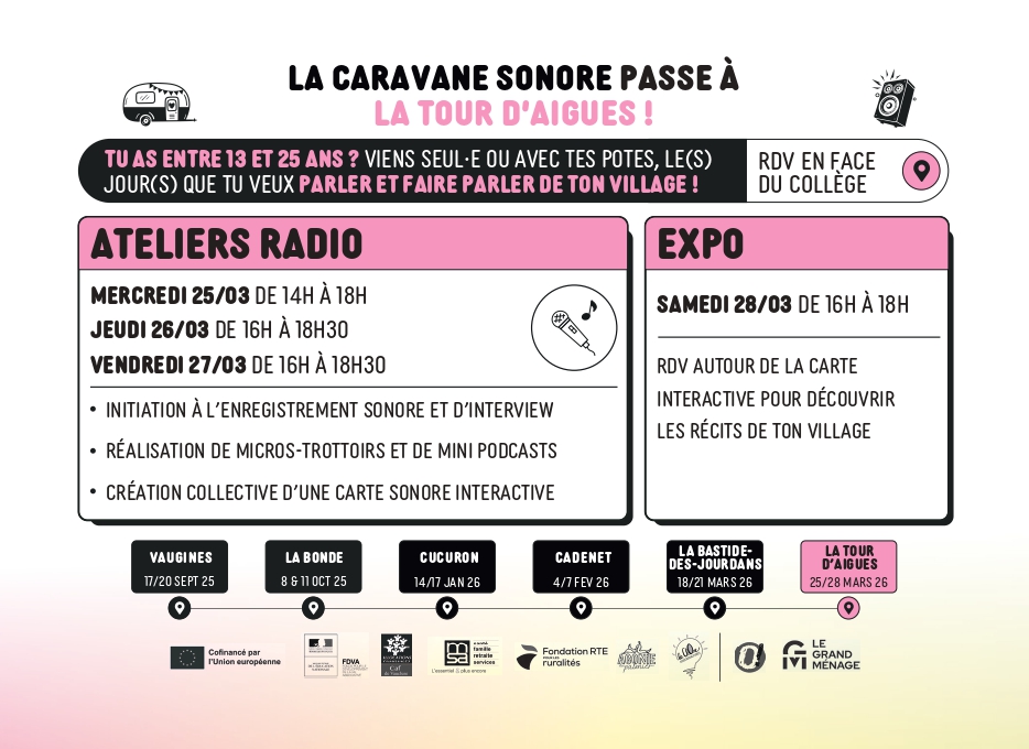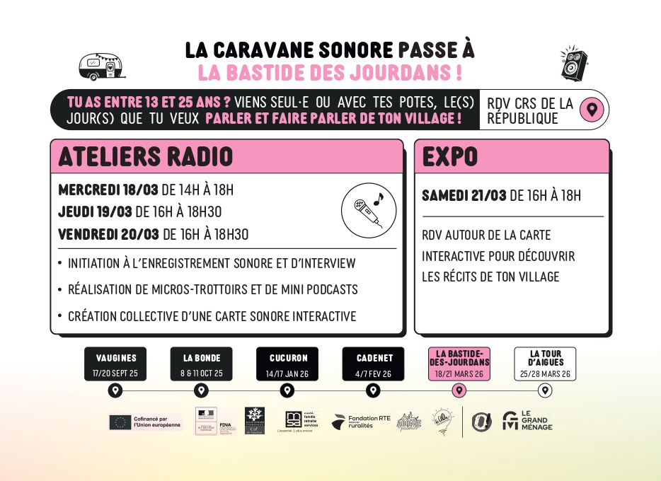 La Caravane Sonore poursuit sa route dans le Sud Luberon Tu as entre 13 et 25 ans ? Viens parler de ton village et rencontrer celles et ceux qui le font vivre à travers des ateliers radio, interviews et enregistrements sonores