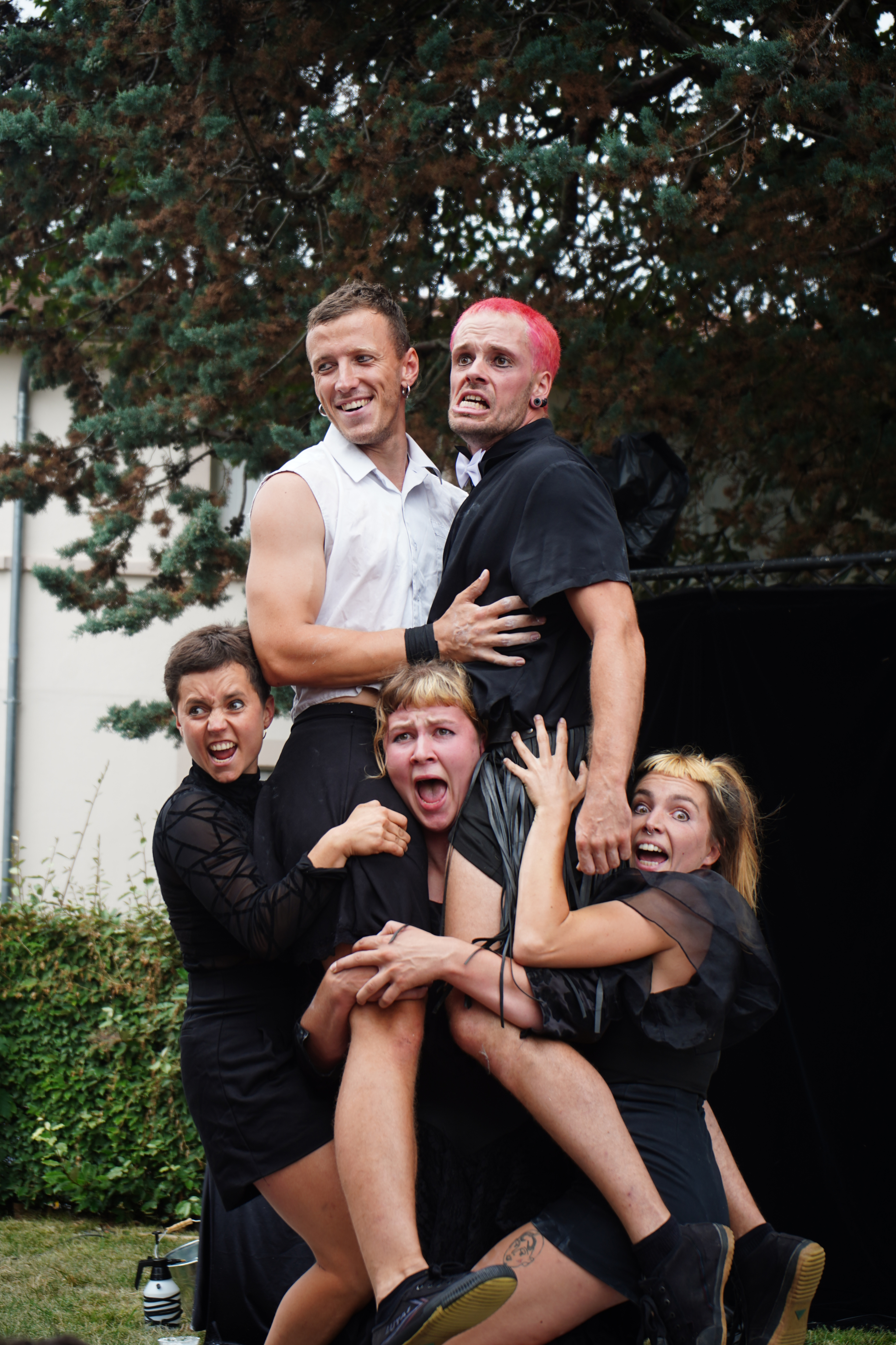 Ce quintette mêle habilement portés acrobatiques, jeu théâtral et humour noir pour aborder des